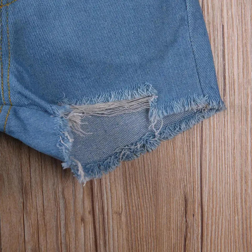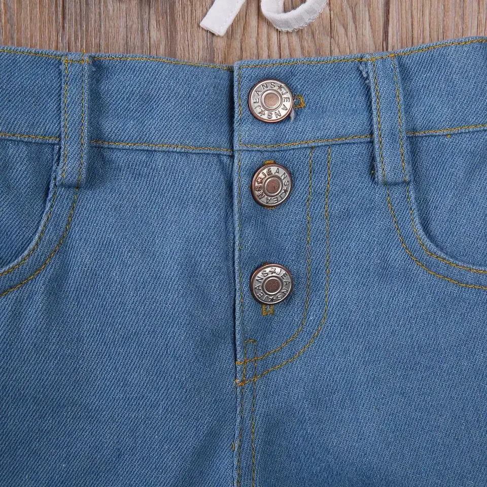 Conjunto infantil feminino Conyson, composto por colete sem mangas com babados, calça jeans esportiva, regata de tricô e shorts jeans rasgados.