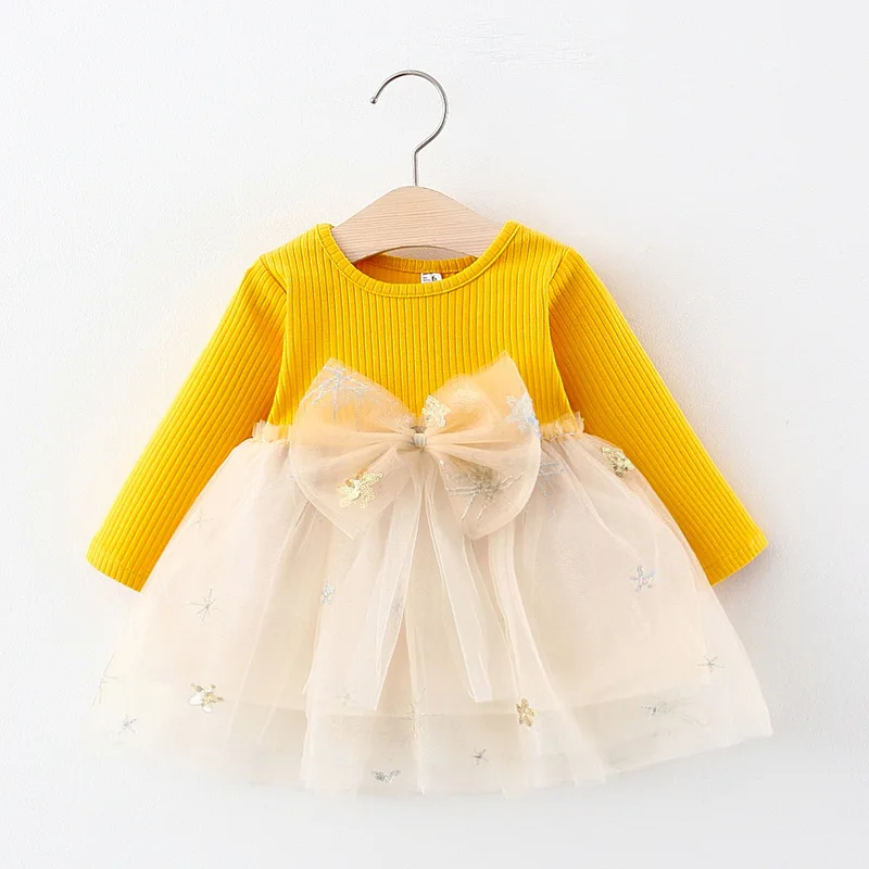 Vestido infantil de malha de manga comprida personalizado para atacado, estilo princesa, com tule, curto, para dança, em cores sólidas, para bebês e meninas.