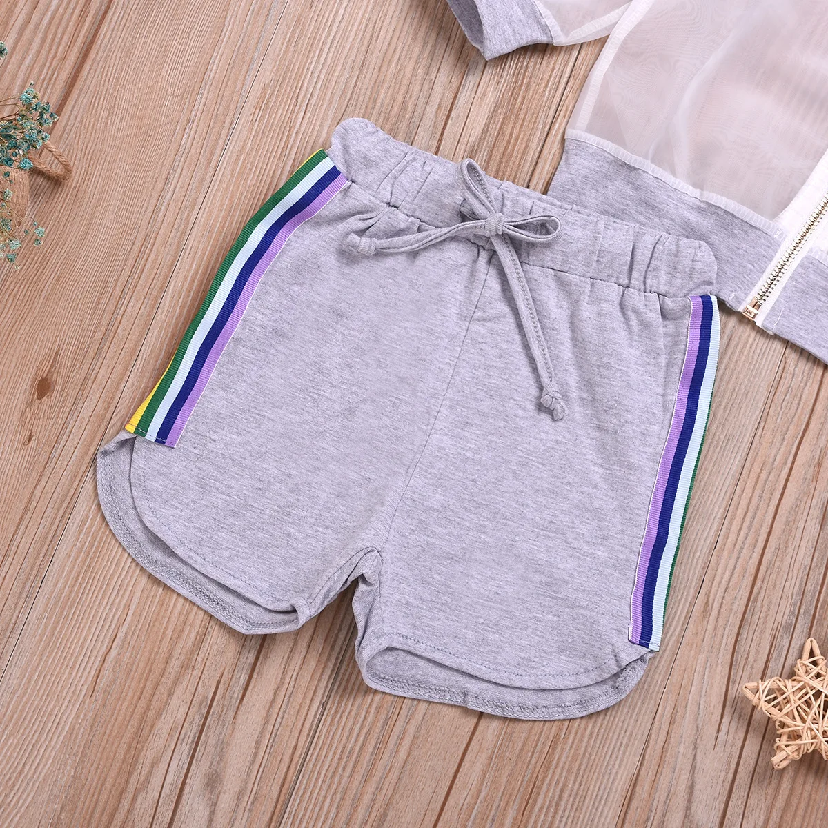 Nome do Produto | Conjunto de roupa infantil para menina, 3 peças: casaco transparente de organza arco-íris com mangas compridas + colete branco + shorts. Roupa esportiva infantil. |